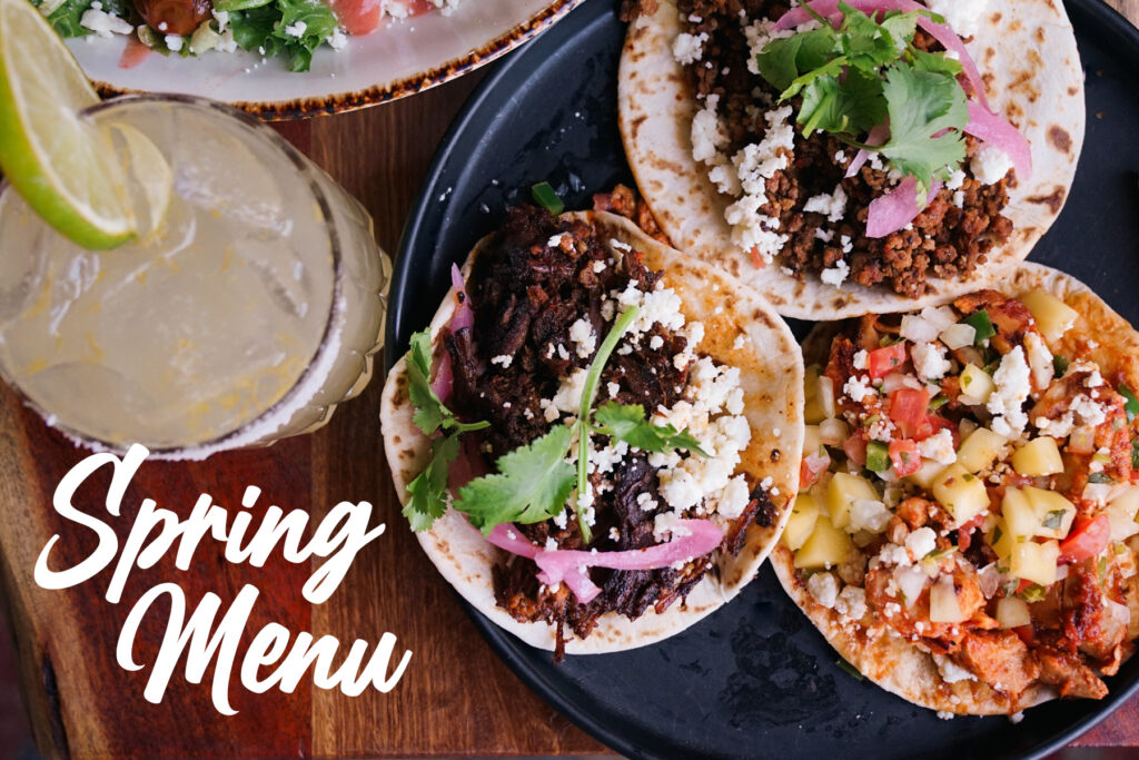 A trio of taco flavors: Hot honey ginger chicken with mango pico; Lamb with cucumber verde salsa; and Beef barbacoa with rojas and cilantro.